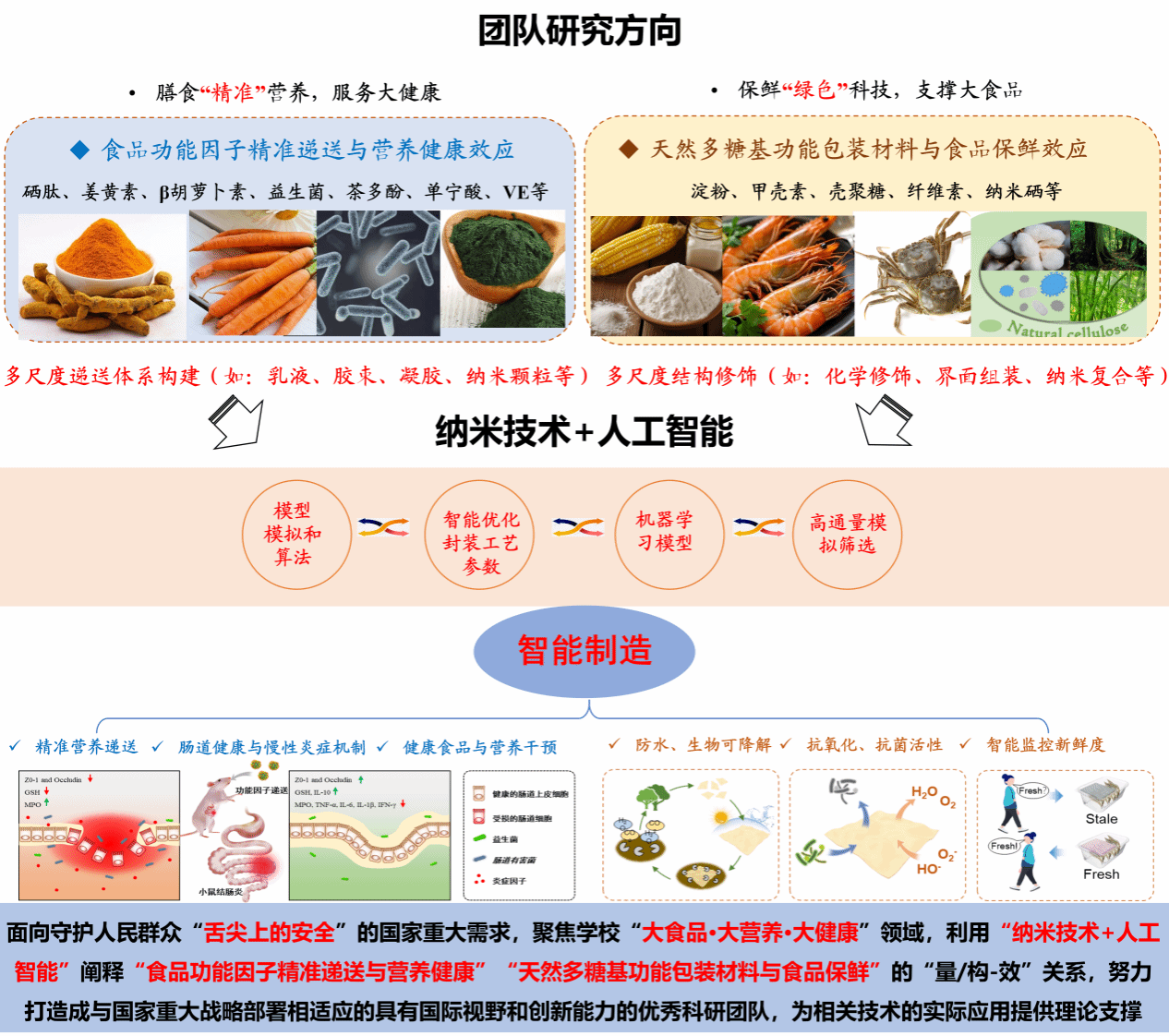 团队紧扣守护人民群众“舌尖上的安全”国家重大需求,锚定学校“大食品・大营养・大健康”核心发展领域,融合食品、化学、材料、医学等多学科交叉技术,依托国家富硒农产品加工技术研发专业中心、大宗粮油精深加工教育部重点实验室、农产品加工与转化湖北省重点实验室等科研平台,重点围绕食品功能因子精准递送与营养健康、天然多糖基功能包装材料与食品保鲜两个研究方向,开展物质“量/构-效”关系研究,致力通过技术创新与理论突破,为食品营养提升、品质保鲜及产业高质量发展提供科学支撑与技术参考。