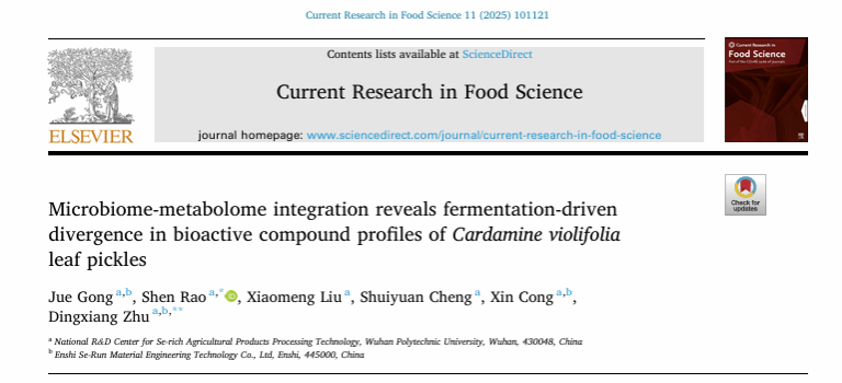 近期,我院教师饶申副教授联合恩施德源硒材料工程科技有限公司在食品领域期刊Current Research in Food Science发表题为“Microbiome-metabolome integration reveals fermentation-driven divergence in bioactive compound profiles of Cardamine violifolia leaf pickles”的研究论文,揭示了不同发酵方式的堇叶碎米荠泡菜活性成分和微生物群落的变化。饶申副教授和朱定祥研究员为论文共同通讯作者。