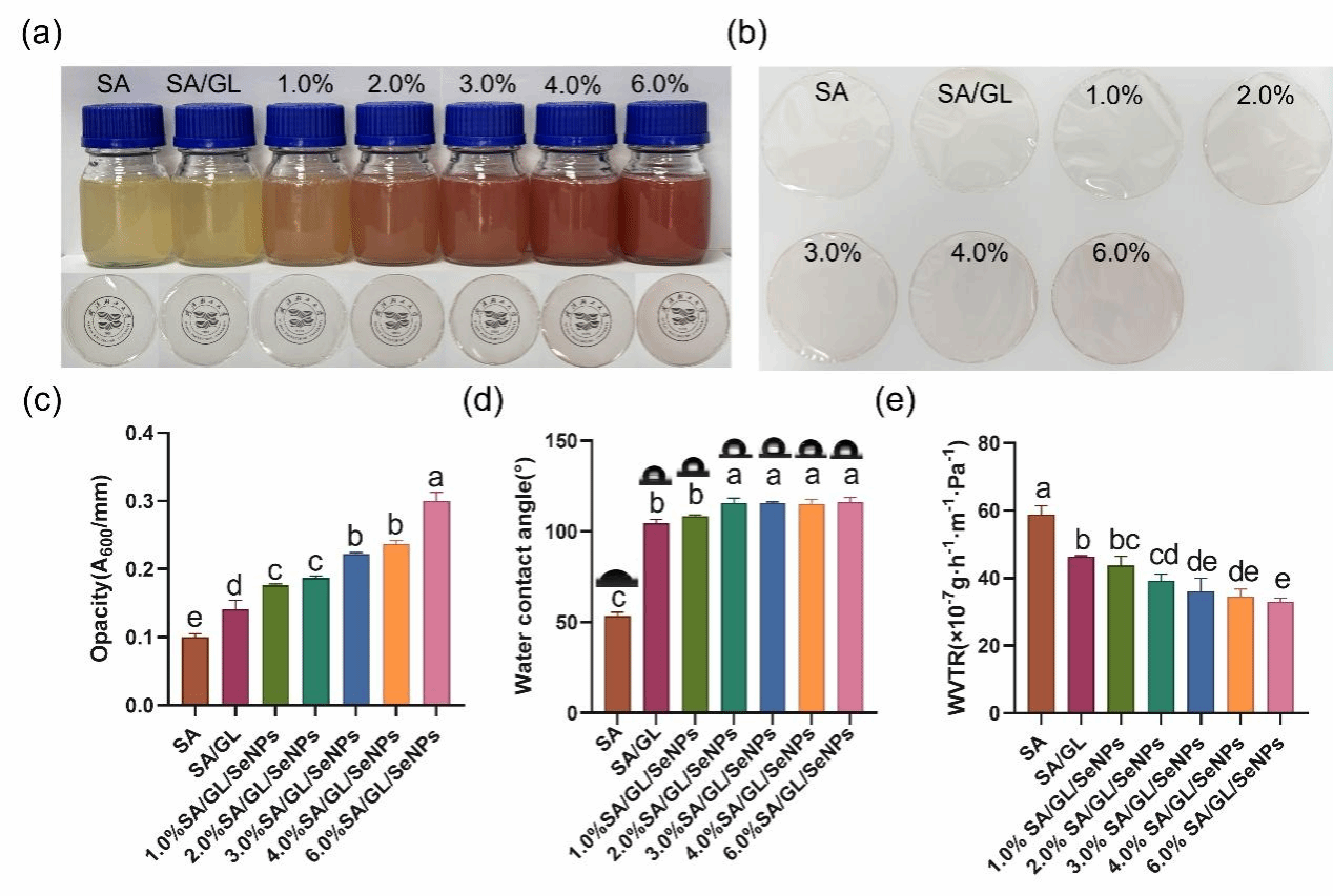 (a)不同SeNPs浓度的成膜溶液;(b)薄膜外观图;(c)薄膜不透明度;(d)水接触角图像及数值;(e)水蒸气透过率。柱状图中数据为3次独立生物学重复实验结果,每个重复进行3次技术重复测定,以平均值±标准差表示。不同小写字母表示组间存在统计学差异(p < 0.05)