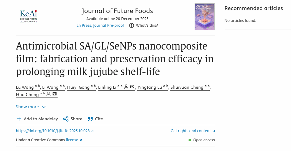 近日,我院教师程华副教授在国际农林领域期刊《Journal of Future Foods》发表题为“Antimicrobial SA/GL/SeNPs nanocomposite film: fabrication and preservation efficacy in prolonging milk jujube shelf-life”论文。团队成功开发出海藻酸钠 / 明胶 / 硒纳米颗粒(SA/GL/SeNPs)复合保鲜膜,通过超声波交联技术构建多功能可食用涂层,使牛奶枣常温货架期从传统的 3-5 天延长至 10 天以上,同时有效保留果实营养与风味,为生鲜水果保鲜提供了绿色高效的新技术方案。硒科学与工程现代产业学院25届研究生王璐为论文第一作者,程华、李琳玲老师为论文通讯作者。