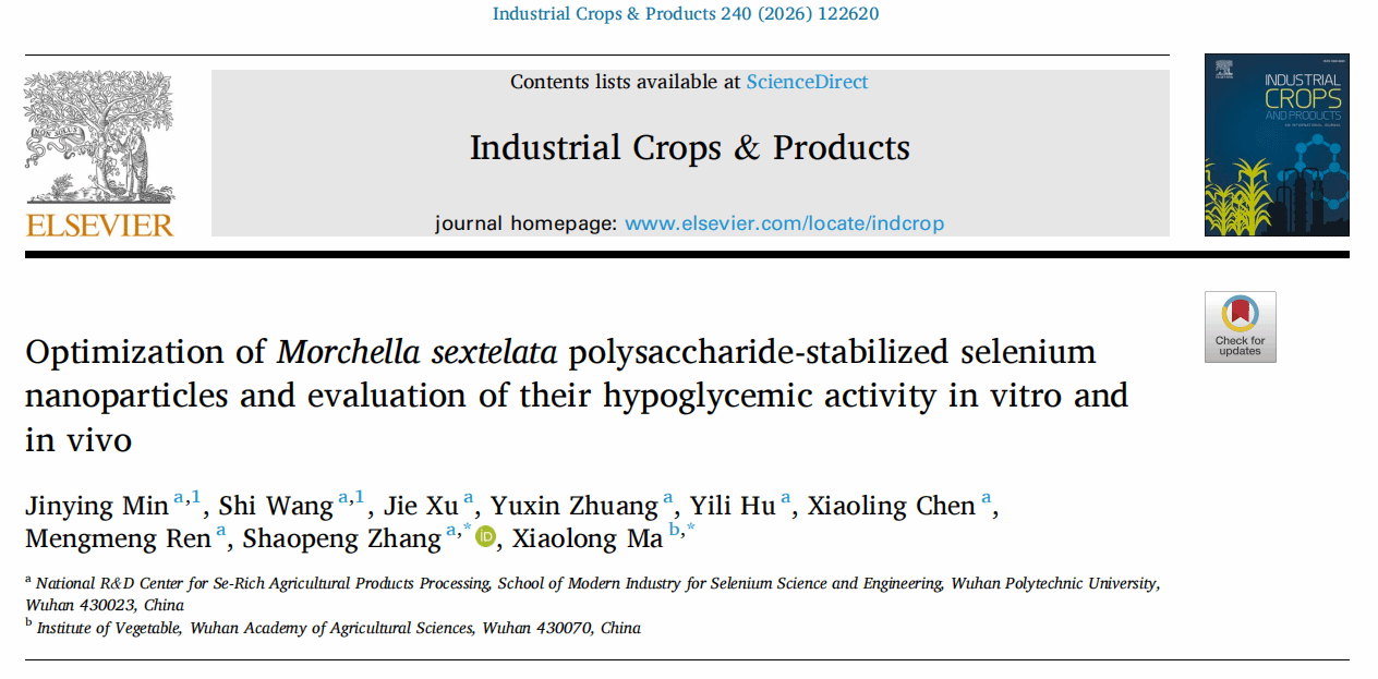 近日,我院教师张绍鹏副教授团队利用羊肚菌多糖修饰纳米硒,制备具有良好稳定性和生物活性的MSP4-SeNPs复合物。通过构建体外-肝细胞胰岛素抵抗细胞模型和体内-Ⅱ型糖尿病小鼠模型,首次揭示该羊肚菌多糖纳米硒的降糖效果及生物安全性,并深入探讨其对Ⅱ型糖尿病的潜在治疗作用。相关研究发表于国际期刊Industrial Crops & Products(一区TOP,IF:6.2)。