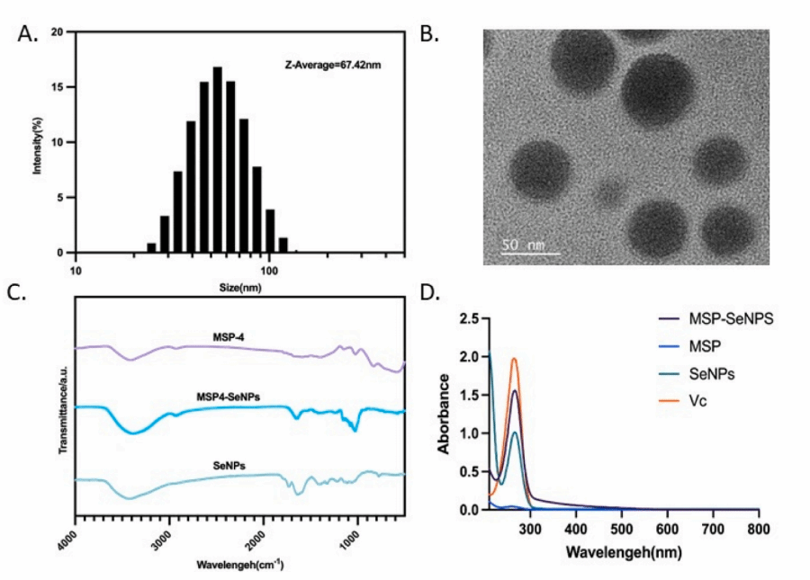 本研究采用抗坏血酸还原亚硒酸钠的方法,以羊肚菌多糖(MSP-4)为稳定剂制备MSP4-SeNPs纳米复合物。通过系统的单因素实验和响应面法优化,确定了最佳制备工艺参数。利用动态光散射(DLS)和傅里叶变换红外光谱(FT-IR)等多种表征手段对纳米颗粒的粒径分布、形貌特征、晶体结构和表面化学性质进行了系统分析,证实了MSP-4成功修饰于纳米硒表面,形成了稳定的纳米复合物体系。