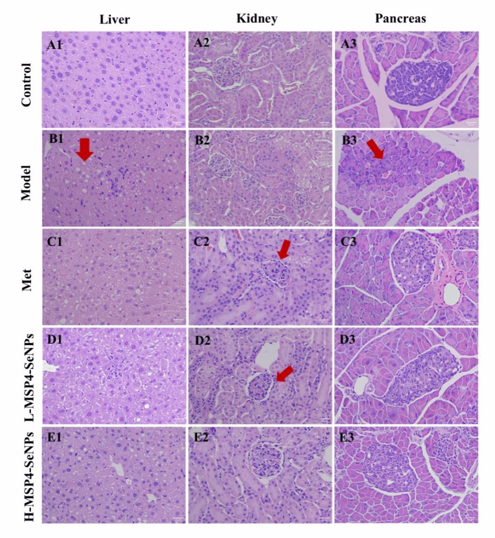 进一步采用高糖高脂饮食联合链脲佐菌素注射成功构建了Ⅱ型糖尿病小鼠模型。通过设置低剂量和高剂量MSP4-SeNPs干预组,系统评价了其体内降血糖活性。经过28天的干预治疗后,MSP4-SeNPs能显著降低糖尿病小鼠的空腹血糖水平,改善葡萄糖耐量,增加肝糖原储备。同时,MSP4-SeNPs干预显著改善了胰岛素抵抗状态,并有效缓解了疾病相关的体重下降。在作用机制研究方面,MSP4-SeNPs可显著调节血清生化指标,包括降低血糖、改善血脂和调节肝功能相关酶活性。组织病理学分析显示,高剂量MSP4-SeNPs能显著改善糖尿病引起的肝脏、肾脏和胰腺的组织损伤。研究结果表明,MSP4-SeNPs通过调控糖代谢关键酶活性和减轻氧化应激,在Ⅱ型糖尿病治疗中展现出良好的应用前景。