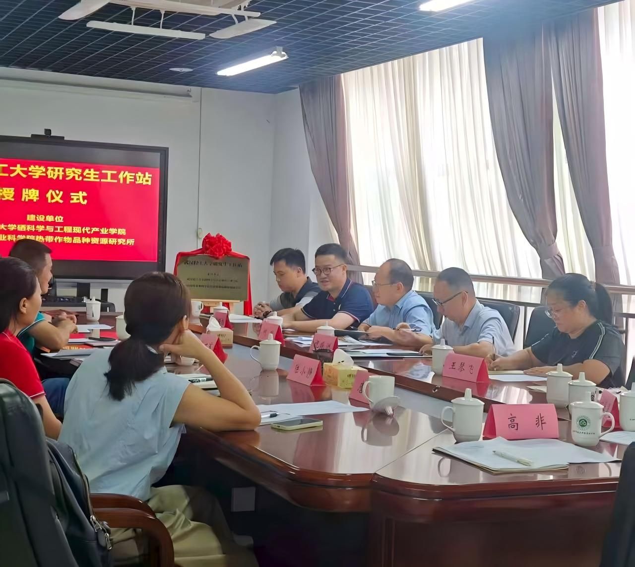 2025年10月11日,武汉轻工大学硒科学与工程现代产业学院(以下简称“硒产业学院”)与中国热带农业科学院热带作物品种资源研究所(以下简称“品资所”)座谈会暨研究生工作站授牌仪式在海口顺利举行。硒产业学院执行院长祝振洲教授、院长助理何毅教授,品资所徐立副所长、申龙斌处长、唐弼副处长、欧文军主任、陆小静副主任,南药研究中心负责人及科研人员、研究生代表等共同出席。本次活动由国家木薯产业技术体系首席科学家张振文研究员主持。